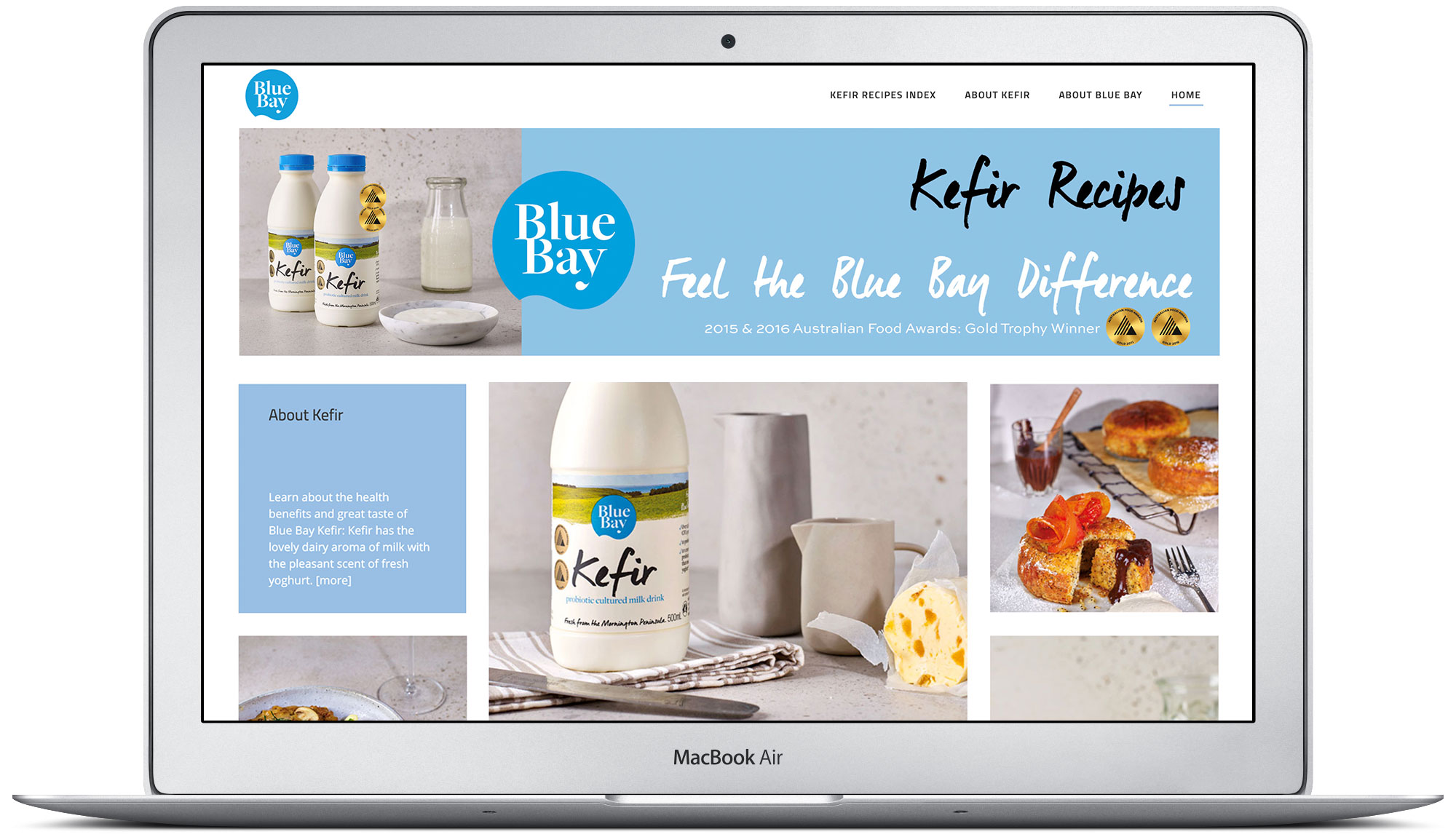 Mornington Peninsula Dairy. Website design incorporates stylised food recipe design and photography laid out in a grid format. kefirrecipes.com.au